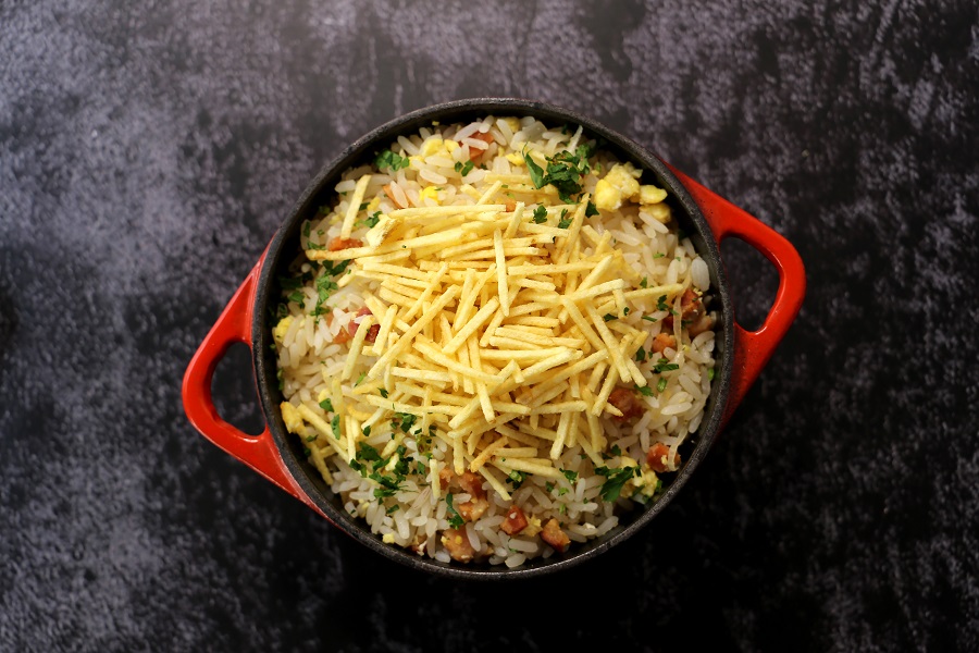 Aqueça uma panela e doure o bacon. Acrescente os ovos e mexa bem, como se fosse preparar ovos mexidos. Em seguida, acrescente o arroz já cozido e acerte o sal. Misture bem para incorporar os sabores. Desligue o fogo quando a preparação estiver bem soltinha na panela. Acrescente a batata-palha e mexa delicadamente para que a batata não esfarele.