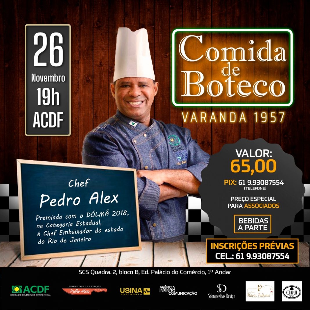 Unindo a missão de conectar pessoas com momentos descontraídos em torno de deliciosos petiscos e cerveja gelada, a Associação Comercial do Distrito Federal promove a primeira edição da série Gastronomia e Network com o premiado chef de cozinha Pedro Alex. O evento ‘Comida de Boteco’, que acontece nesta sexta-feira (26) será realizado na Varanda 1957, na sede da entidade.  Programado para iniciar às 19h da noite, o evento contará com um buffet variado, onde os  participantes  poderão degustar a vontade de todas as delícias que serão disponibilizadas pela casa.