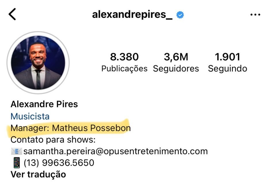 Até a tarde dessa segunda (4), Alexandre Pires mantinha o nome de seu produtor no perfil do Instagram. Nesta terça (5), porém, o contato já havia sido substituído pelo e-mail de Samantha Pereira, da Opus Entretenimento.