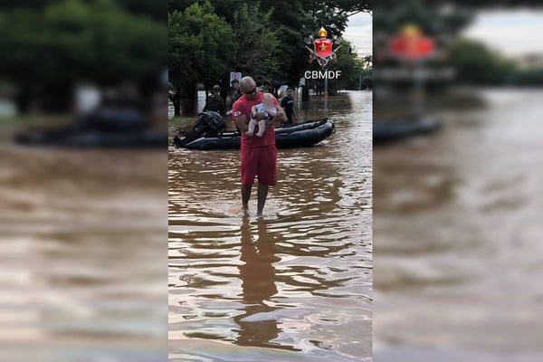 O DF já enviou 14 bombeiros militares, dois agentes da Defesa Civil e dois cachorros para ajuda nos resgates às vítimas das fortes chuvas que atingem o Rio Grande do Sul.