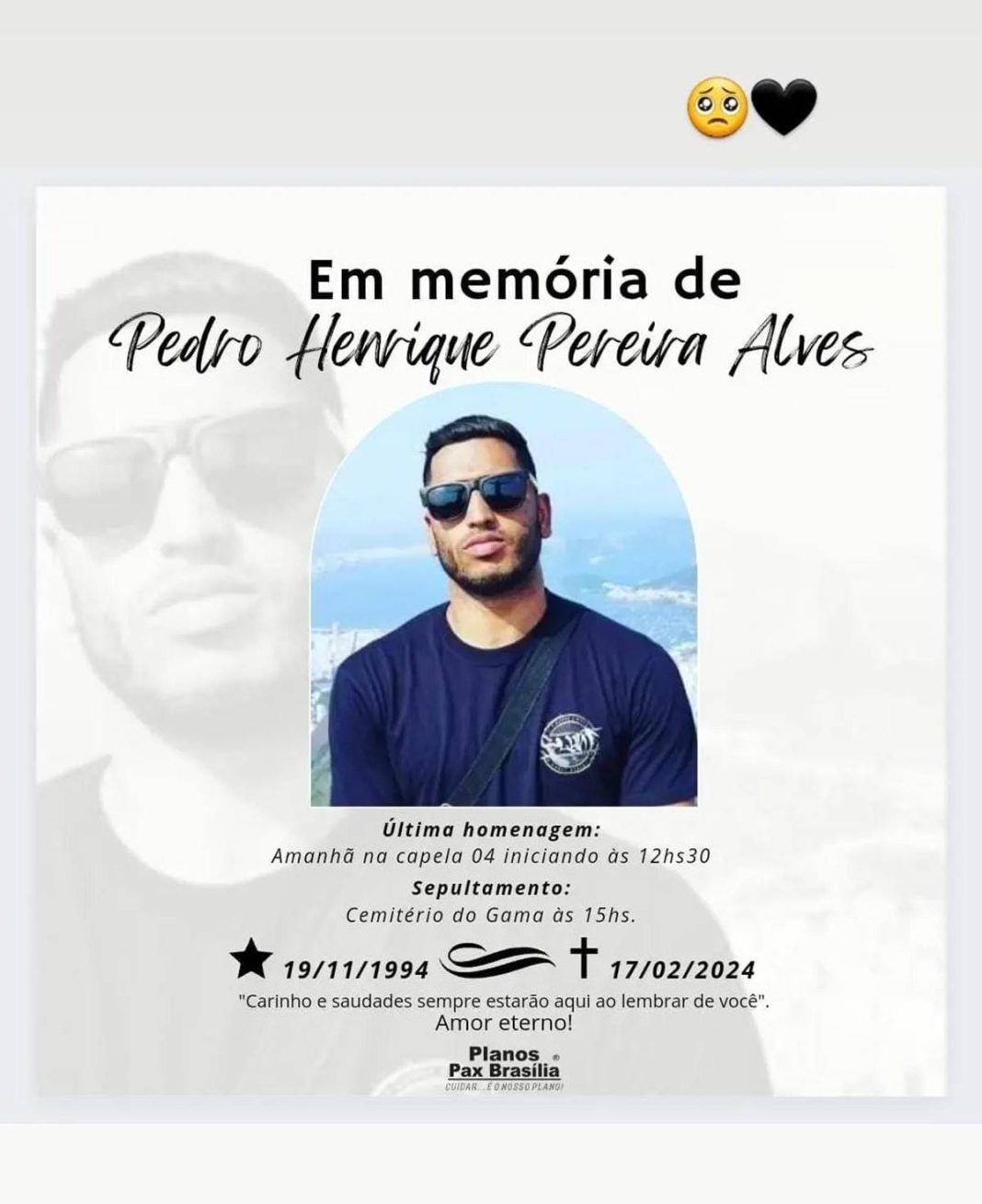 O jovem Pedro Henrique Pereira Alves, 29 anos, que morreu afogado em uma cachoeira de Alto Paraíso (GO), na região da Chapada dos Veadeiros, será enterrado nesta segunda-feira (19/2), no Cemitério do Gama (DF).
