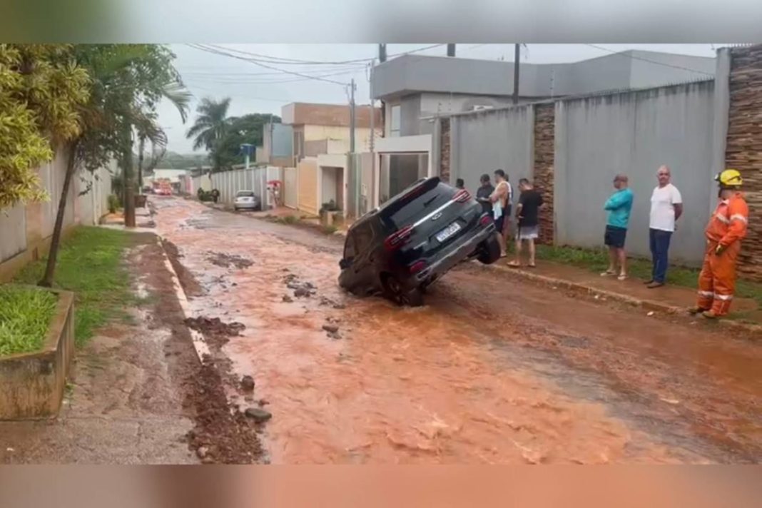 Buraco aberto em pista “suga” carros durante chuvas no DF. Vídeos