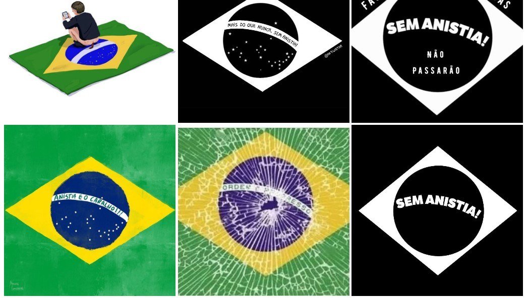 Várias bandeiras do Brasil modificadas em arte com críticas políticas