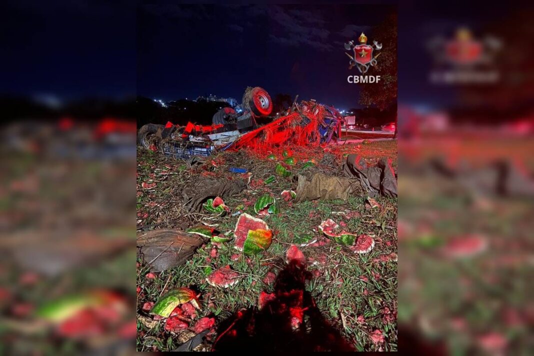 Uma carreta que transportava melancias capotou depois de bater contra um poste de iluminação pública, após um acidente com cinco carros na BR-020.