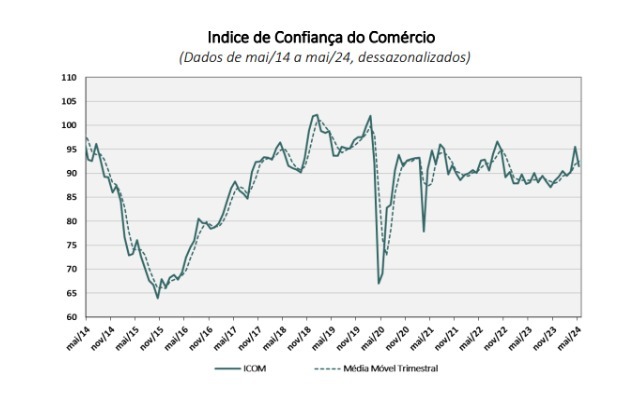 O Índice de Confiança do Comércio (ICOM), divulgado nesta quarta-feira (29) pelo FGV IBRE, recuou 4,0 pontos em maio, chegando a 91,5 após duas altas consecutivas. Com relação às médias móveis trimestrais, o índice manteve alta pelo sexto mês consecutivo, apresentando 0,7 pontos, batendo 92,5 pontos percentuais.