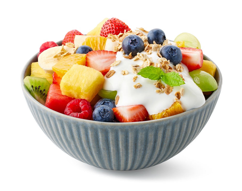 Em uma tigela (bowl), disponha as frutas lavadas e cortadas. Adicione o iogurte por cima e finalize com a granola. Para um toque extra, adicione um fio de mel ou sementes (como chia ou linhaça).
