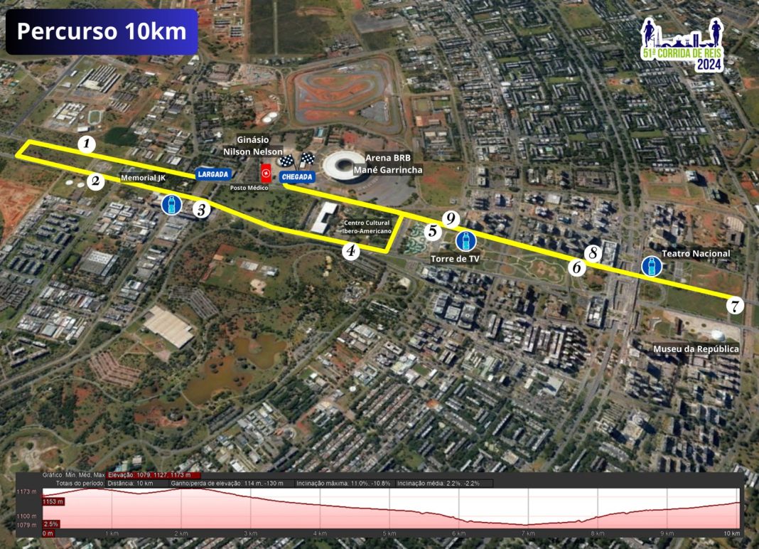 Os atletas inscritos na prova dos 10 km, ao acessar a pista de ligação entre S1 e N1 em frente ao Eixo Cultural Ibero-Americano, seguirão pela Via S1 em direção à Esplanada dos Ministérios. Na altura do Museu da República os atletas retornarão ao local de chegada localizado no Nilson Nelson.