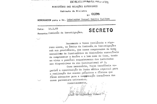 Um novo relatório secreto chegou à mesa do ministro José de Magalhães Pinto, em Brasília, em 7 de março de 1969. Na época, o chefe do Itamaraty recebia documentos sigilosos sobre a vida pessoal de profissionais do Ministério de Relações Exteriores. O ofício, após meses de análises, indicava resultados da Comissão de Investigações Sumárias (CIS): diplomatas brasileiros devem ter suas carreiras prontamente finalizadas por meio de aposentadoria compulsória. Os profissionais eram homossexuais e, segundo o entendimento do governo militar, tal “incontinência pública escandalosa” poderia “comprometer o decoro e o bom nome” do país.