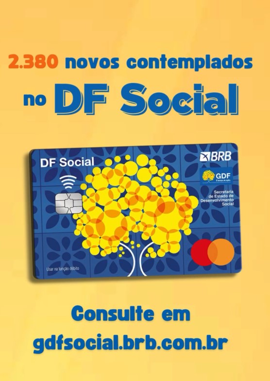 A Secretaria de Desenvolvimento Social (Sedes) convoca 2.380 novas famílias beneficiárias do programa DF Social para abrirem a conta social no BRB e terem acesso ao auxílio mensal de R$ 150. Para garantir o próximo pagamento, é preciso ter a conta social no BRB (não se trata de uma conta bancária comum) aberta até as 18h do dia 25 deste mês.