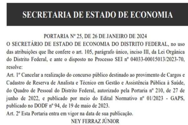 A realização do concurso da Secretaria de Saúde do Distrito Federal (SES-DF) para as carreiras de analista e técnico em gestão e assistência pública à saúde foi cancelada, de acordo com a publicação feita no Diário Oficial (DODF) desta quinta feira (1º/2).
