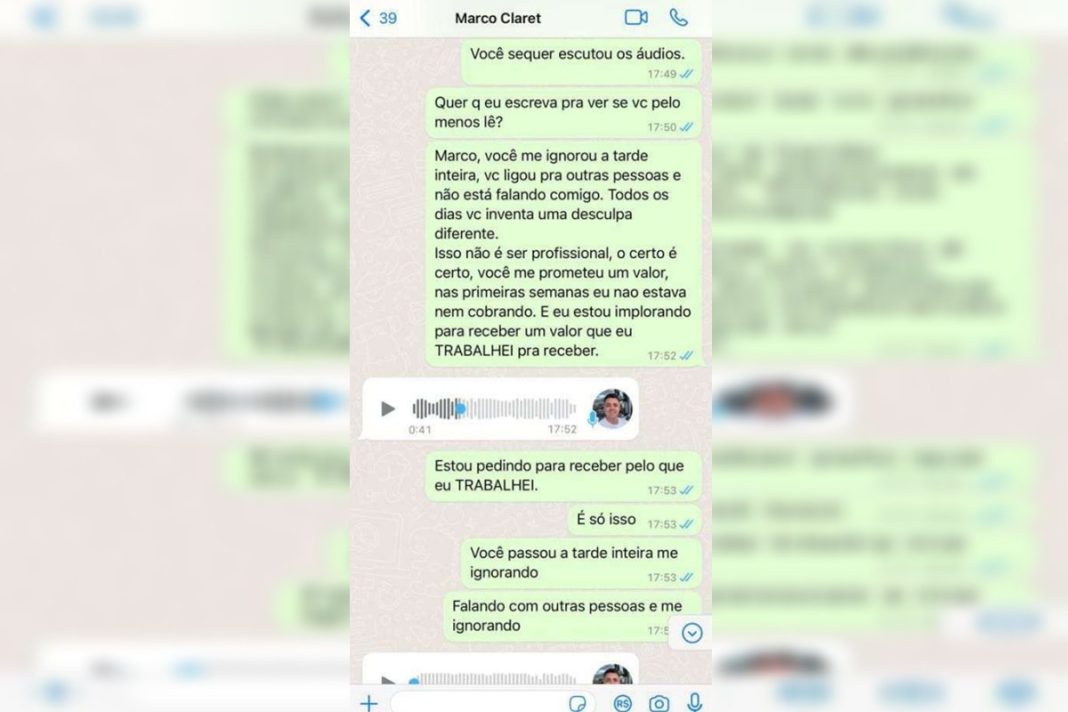 Em conversas pelo WhatsApp, a social media cobrou Marco Aurélio para que realizasse o pagamento, mas ele dizia que estava para receber e não efetuava o pagamento. O Metrópoles teve acesso às conversas. Veja: