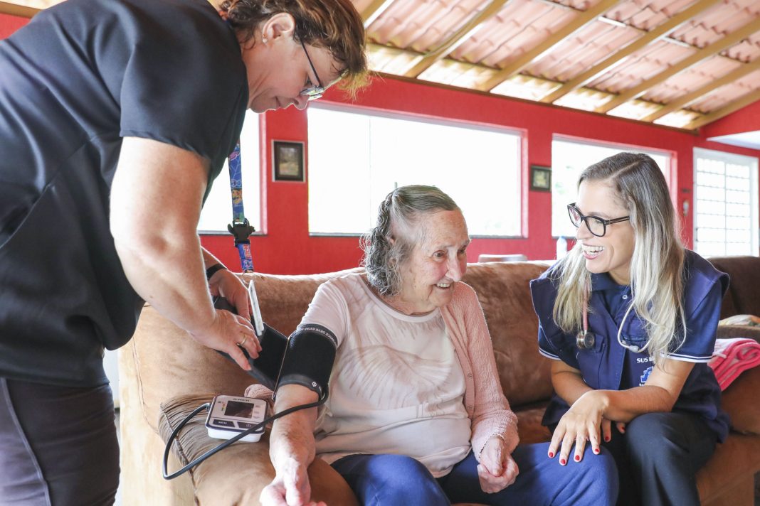 Além de acompanhamento médico, ela faz três sessões semanais de fisioterapia, o que tem ajudado a melhorar as dores que sente nas pernas, e também recebeu a vacina da gripe. Tudo sem precisar sair de casa.