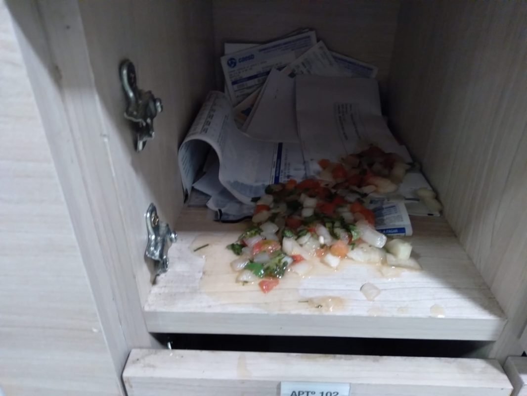 A situação, no entanto, piorou nos últimos dois meses. “Acho que na segunda ou no domingo, não sei, ele fez uma pichação grande me xingando de “piranha” próximo aos escaninhos. Ele colocou preservativos, inclusive aparentemente usados. Coloca comida estragada. Ele serrou o escaninho, além de ter cortado em duas partes a porta”, conta a administradora do edifício.