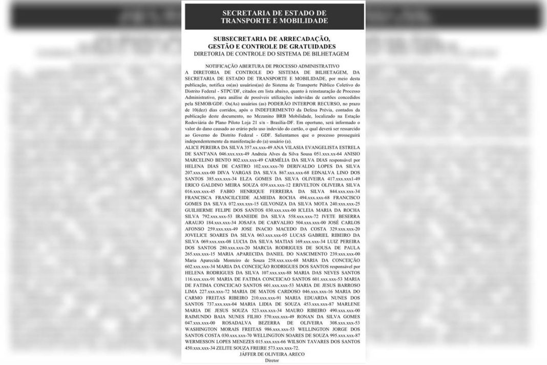 O Governo do Distrito Federal (GDF) divulgou o nome dos passageiros do Sistema de Transporte Público Coletivo (STPC-DF) que tiveram processo administrativo aberto por uso indevido dos cartões de livre acesso aos serviços de mobilidade. A lista pode ser conferida no Diário Oficial (DODF) desta quarta-feira (12/6).