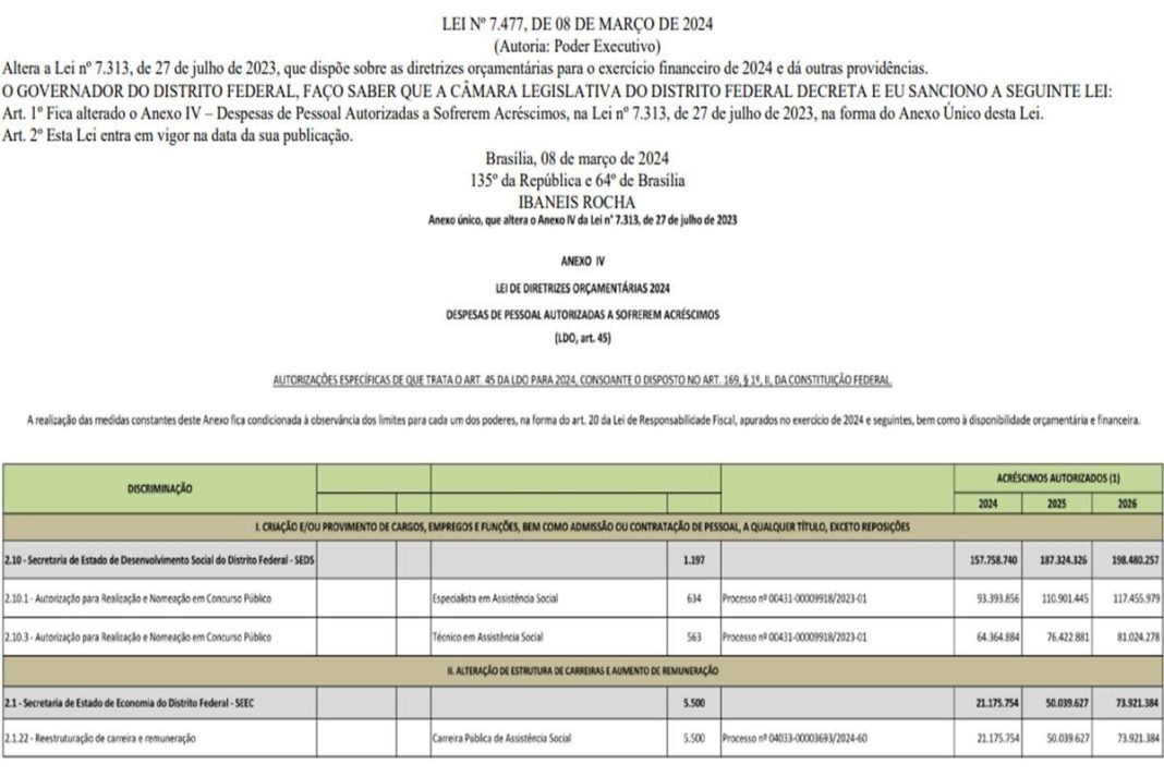 Pela Lei de Diretrizes Orçamentárias (LDO) de 2024, a Secretaria de Desenvolvimento Social do Distrito Federal (Sedes) recebeu autorização para promover novo concurso público, com contratação de 1.197 servidores técnicos (563) e especialistas (634) da carreira de assistência social.