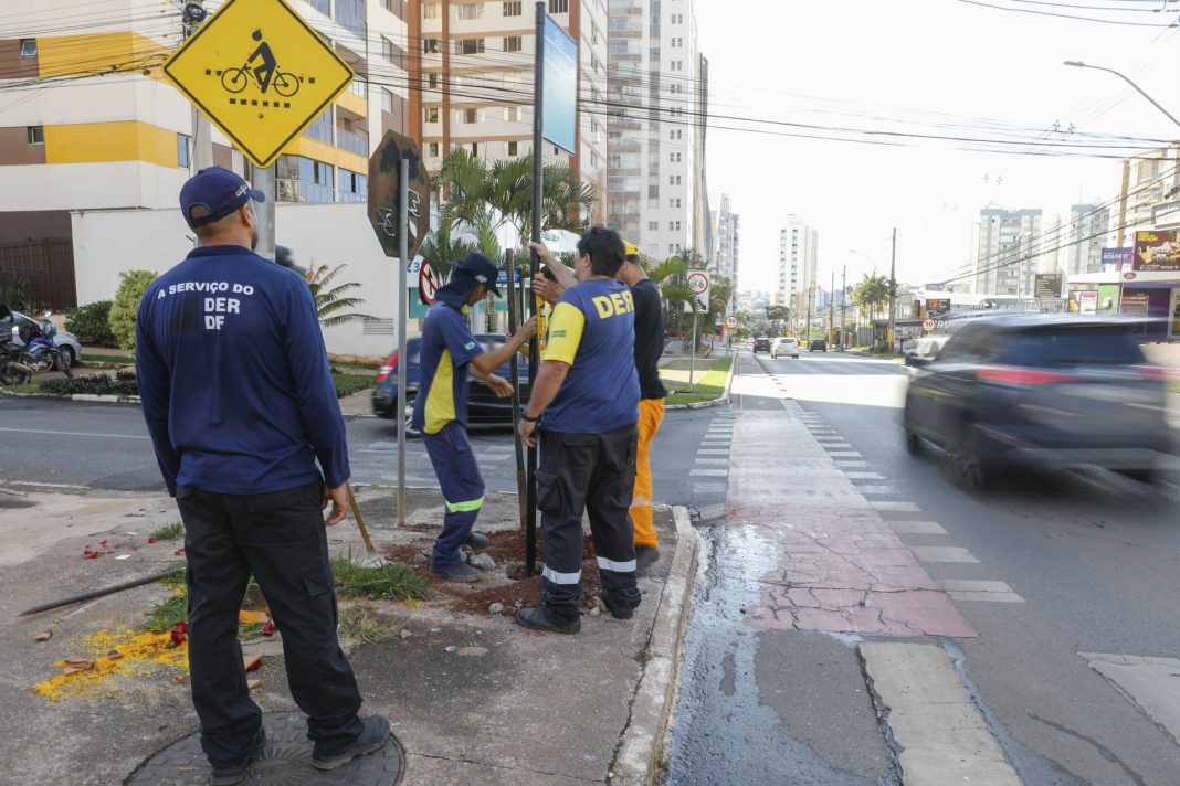 Essenciais para guiar a população pelas ruas do Distrito Federal, as placas com endereçamento passaram por manutenção. Responsável por esse procedimento, o Departamento de Estradas de Rodagem (DER-DF) investiu aproximadamente R$ 1,4 milhão para instalar mais de 930 placas entre janeiro e abril deste ano. O serviço abrange uma série de procedimentos, desde a simples troca do adesivo, colocação no prumo e aplicação de novas camadas de pintura até a instalação de sinalizações novas.