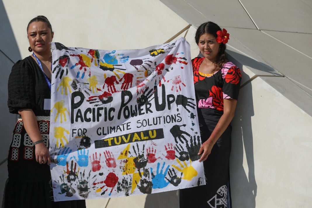 “Não estamos afundando, estamos lutando”, diz faixa empunhada por ativistas do Pacífico em protesto na COP28