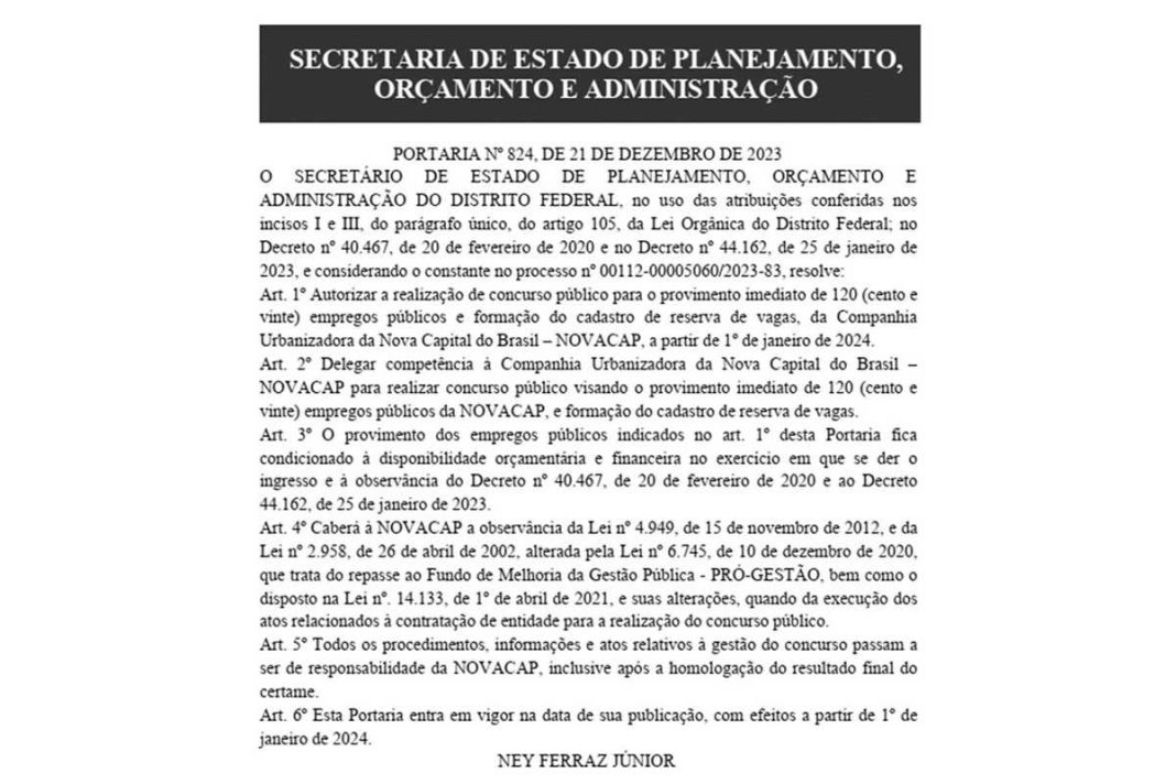 A Secretaria de Planejamento, Orçamento e Administração do Distrito Federal (Seplad) autorizou a Companhia Urbanizadora da Nova Capital (Novacap) a abrir um novo concurso público. A decisão consta no Diário Oficial (DODF) desta sexta-feira (22/12).