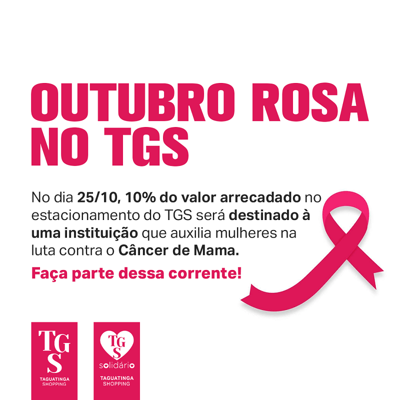 Mais do que conscientizar, o mês de outubro é sobre celebrar e, sobretudo, apoiar tantas mulheres que sofrem ou venceram o câncer de mama. Estudos inéditos feitos pela Sociedade Brasileira de Mastologia (SBM) comprovaram um aumento de cerca de 26% nos casos de câncer de mama nos estágios mais graves da doença no Brasil. Pensando nisso, no dia 25 de outubro, o Taguatinga Shopping destinará 10% da verba arrecadada de seu estacionamento para a Rede Feminina de Combate ao Câncer de Brasília.