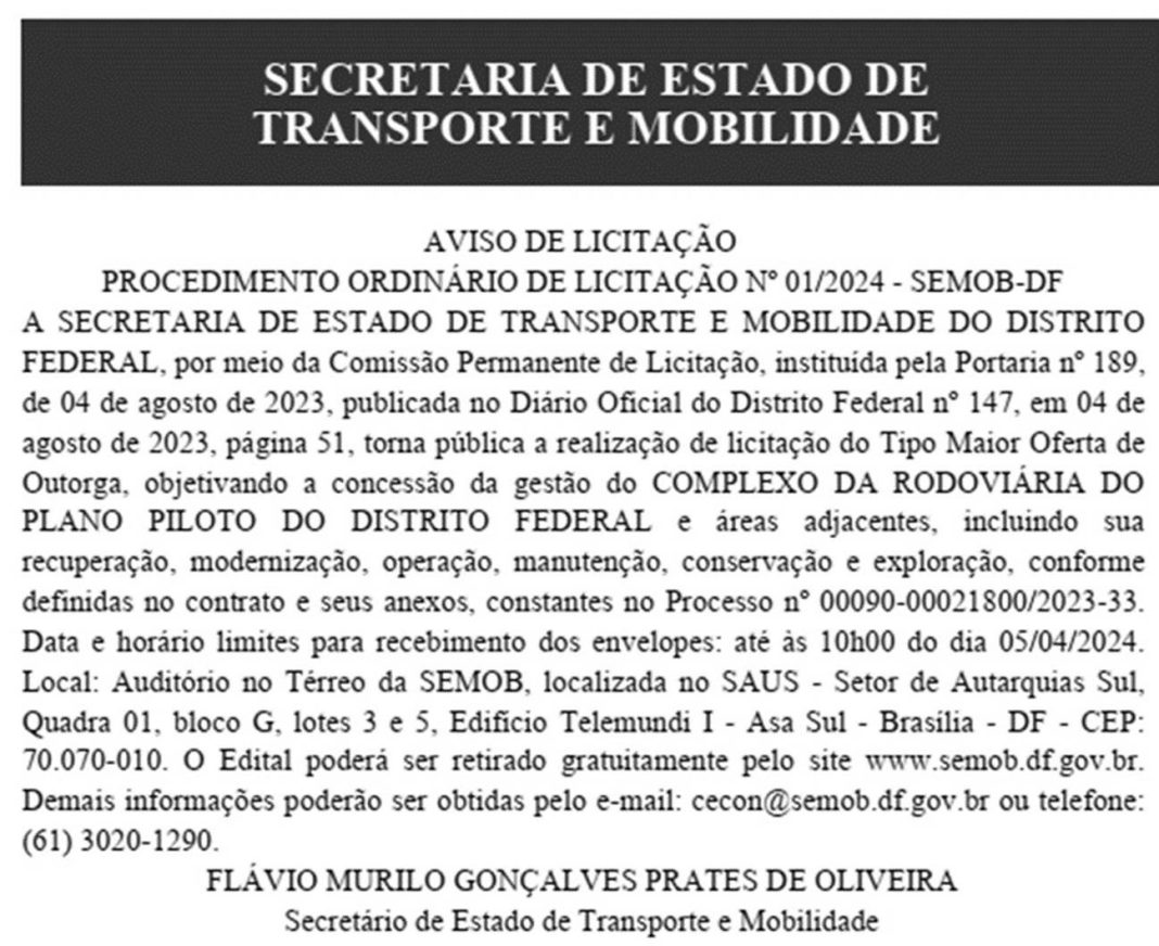 A Secretaria de Transporte e Mobilidade do Distrito Federal (Semob) tornou pública licitação que prevê a concessão da gestão da Rodoviária do Plano Piloto. A informação foi publicada na edição desta segunda-feira (5/2) do Diário Oficial do Distrito Federal (DODF).