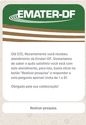 A Getin coordenou a pesquisa quantitativa feita por meio do Chatbot no WhatsApp. Foram enviadas 1056 mensagens para os produtores rurais atendidos pelos extensionistas na Emater-DF em todo o Distrito Federal nos meses de maio a junho. Desse total, 225 pessoas responderam efetivamente à pergunta sobre o nível de satisfação do recente atendimento recebido. Na resposta, o produtor selecionou uma dentre cinco opções, sendo 1 para ruim, 2 para péssimo, 3 para razoável, 4 para bom e 5 para excelente. 199 produtores avaliaram o atendimento recebido como excelente, 22 como bom e 4 como razoável.
