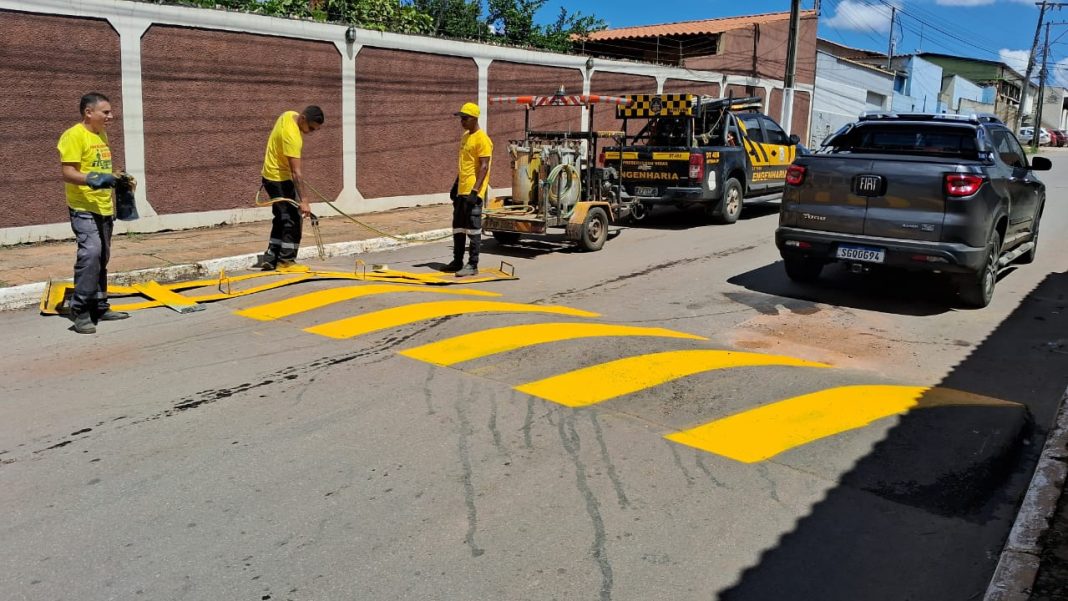 A pintura e a colocação de placas nos 13 novos quebra-molas instalados garantem mais segurança ao tráfego de veículos e pedestres no local | Foto: Divulgação/Detran-DF