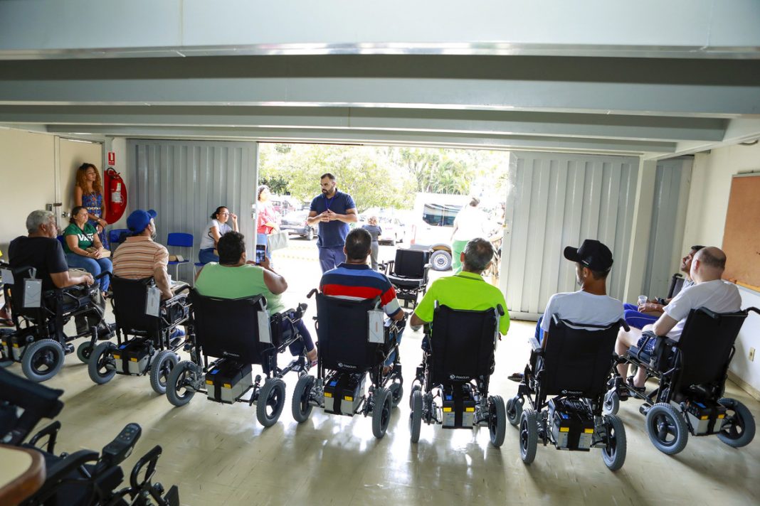 Beneficiários de programa de cadeiras de rodas recebem instruções sobre a operação do equipamento