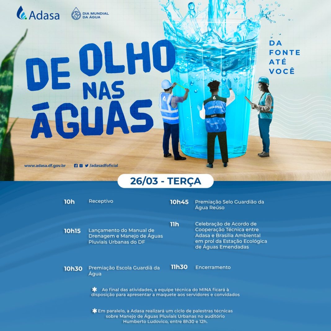 A Agência Reguladora de Águas, Energia e Saneamento Básico do Distrito Federal (Adasa) vai premiar, nesta terça-feira (26), experiências de sucesso relacionadas ao uso responsável dos recursos hídricos desenvolvidas em escolas, bem como ações de reúso em estruturas prediais no DF. O evento alusivo ao Dia Mundial da Água, comemorado na sexta (22) será realizado na sede da instituição, a partir das 10h.