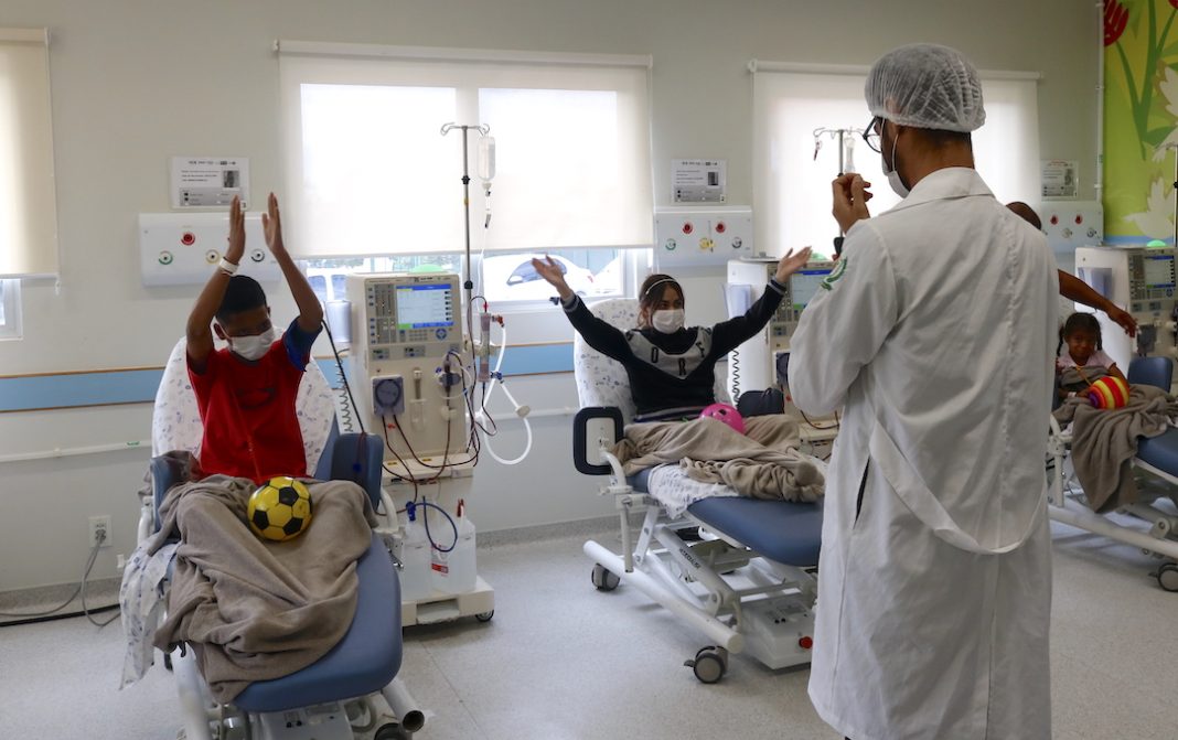 “Essa atividade é muito benéfica, melhora a capacidade funcional, [levando] bem-estar e qualidade de vida às crianças”, afirma a fisioterapeuta Glaciele Xavier. Ela acompanha os exercícios conduzidos pelos estagiários de fisioterapia que atuam no hospital, orientando quanto ao atendimento oferecido na hemodiálise e verificando a disposição de cada criança.