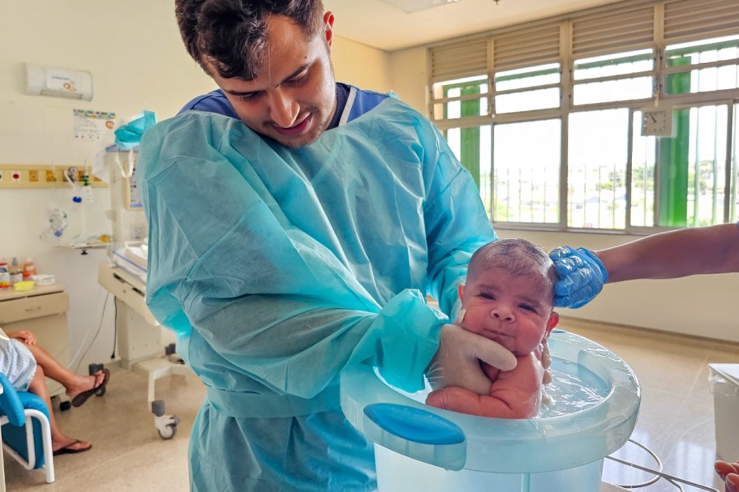 Na técnica da ofuroterapia, o pequeno espaço e água quente simulam o útero e tranquilizam o recém-nascido | Fotos: Jurana Lopes/ IgesDF