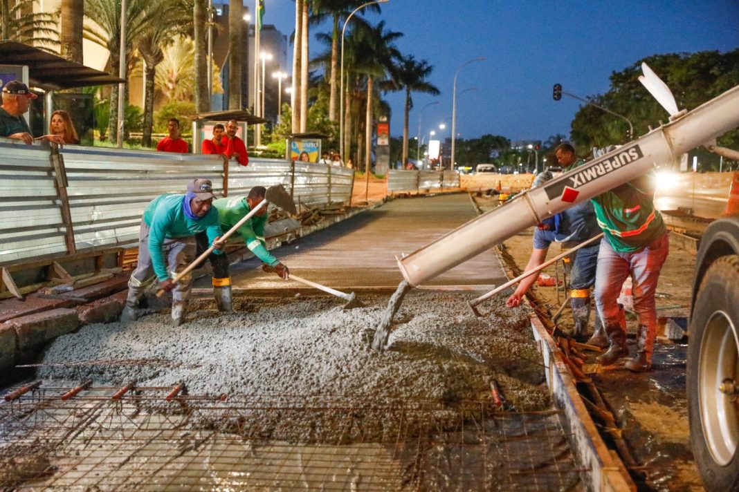 As obras na W3 Sul, no sentido Centro-Sul, tiveram o horário estendido para acelerar ainda mais os trabalhos de concretagem neste sábado (27), que seguiram até as 20h. Máquinas e operários entraram em ação na via antes das 8h e, em 12 horas, foram feitos os serviços de terraplanagem, compactação do solo e concretagem da faixa destinada aos ônibus. Com investimentos da ordem de R$ 25,6 milhões, a obra gera cerca de 240 empregos diretos e indiretos.