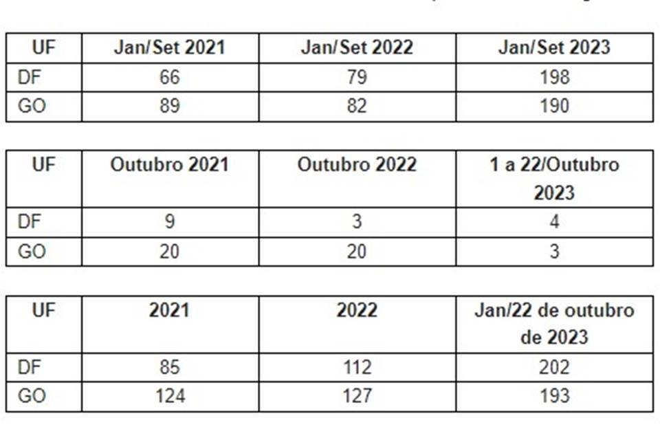 As rodovias do Entorno do DF apresentam um cenário parecido. Entre 1º de janeiro e 22 de outubro de 2023, foram 193 flagrantes. No mesmo recorte de 2022, 102. Em termos percentuais, o crescimento foi de 89,2%.