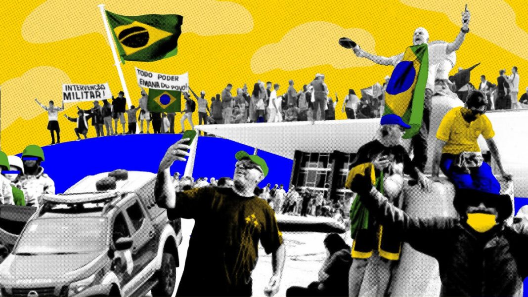 A Esplanada dos Ministérios, em Brasília, foi tomada por golpistas que estavam acampados havia dias em frente ao Quartel-General do Exército, onde faixas pediam “intervenção militar” e “socorro às Forças Armadas”. Sob a letra da Lei 14.197, de 2021, instigar militares contra as instituições democráticas é crime.