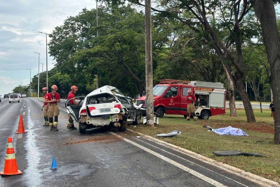 Em imagens registradas pelo Metrópoles e pelo Corpo de Bombeiro Militar do Distrito Federal (CBMDF), é possível ver o carro totalmente destruído após a colisão com um poste, enquanto equipes da corporação tentavam salvar a vida da vítima.