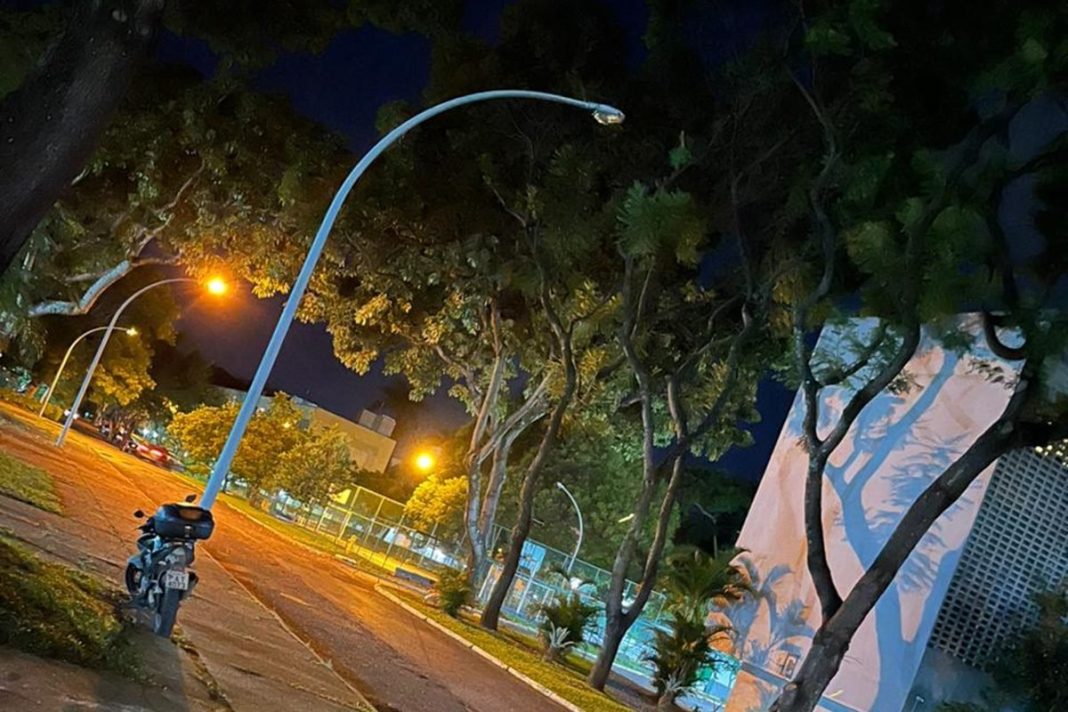 Sem iluminação e com árvores dificultando a visão da região, Farah, que também é síndico do bloco E, precisou instalar dois refletores auxiliares para iluminar os arredores do prédio.