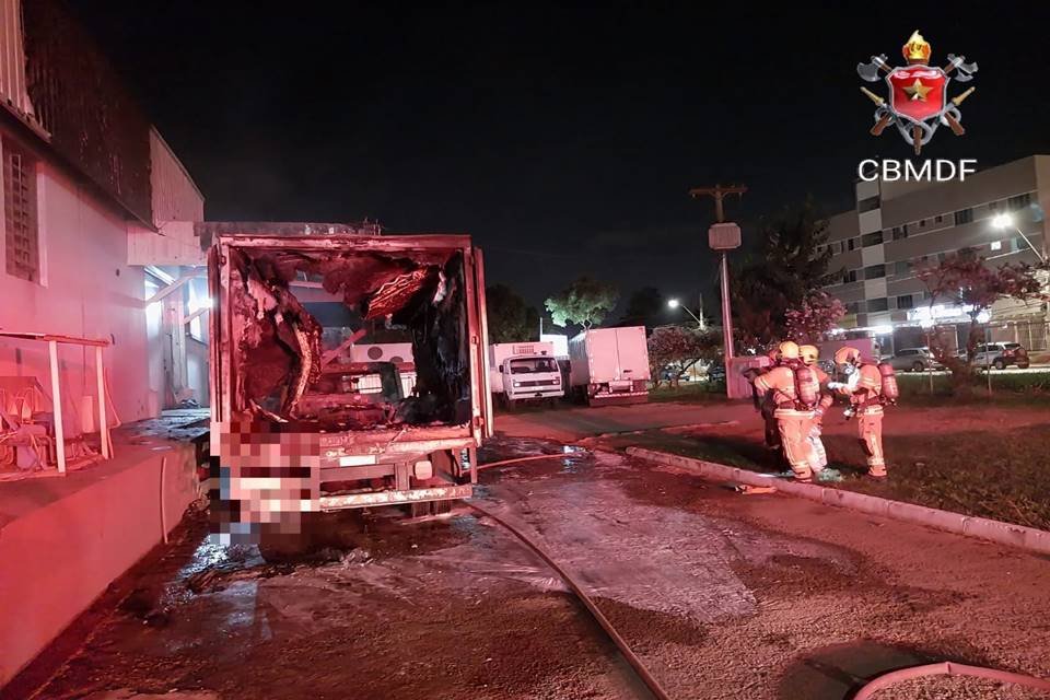 No local, as equipes se depararam com dois caminhões modelo Volkswagen 9.150 E, do tipo baú refrigerado, estacionados ao lado de um galpão e totalmente atingidos pelas chamas.
